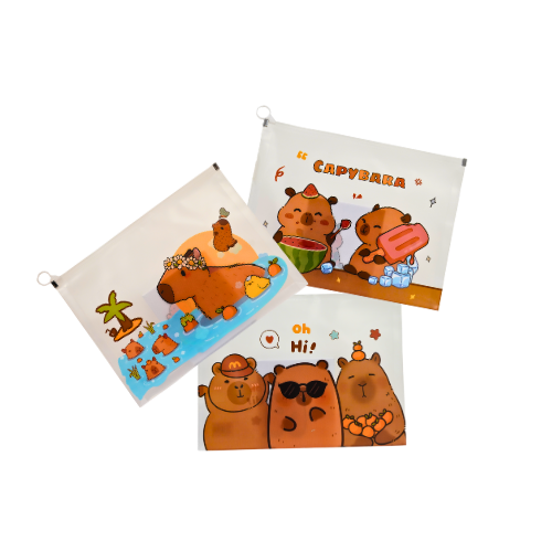Carpeta plástica con diseño de capibara para mantener tus hojas organizadas.
