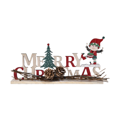 Letrero decorativo con mensaje “Feliz Navidad” y duende.