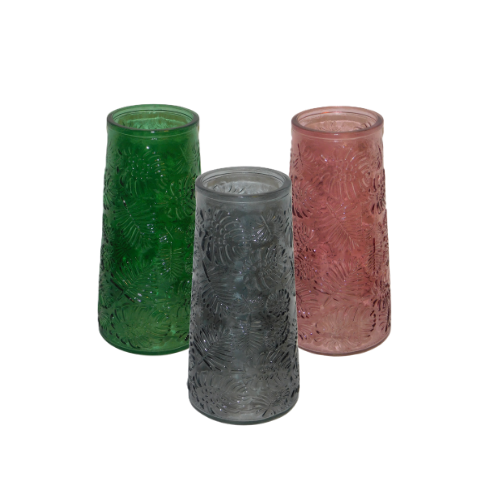 Florero rosa con diseño en relieve.