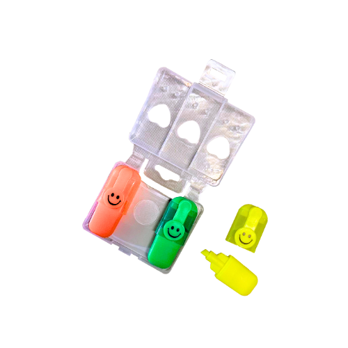 Marcadores de 3 colores con caritas divertidas y estuche rígido.