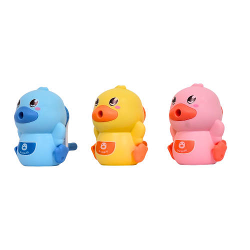 Sacapuntas con forma de pato y depósito integrado.