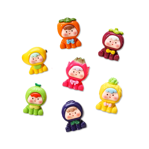 Figura decorativa estilo “baby fruit”, colorida y llamativa.