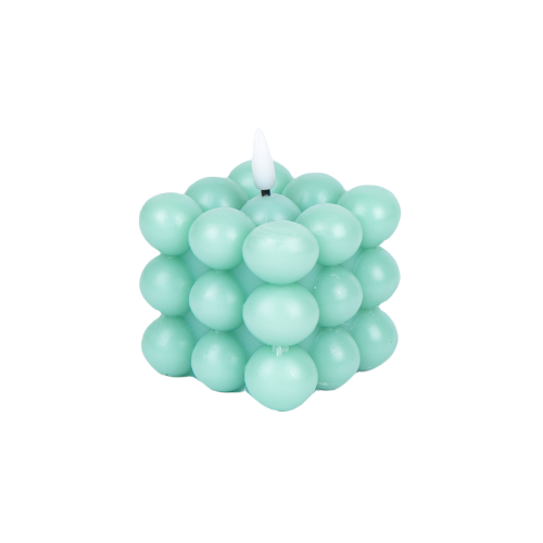 Vela en forma de cubo con luz cálida que crea ambientes acogedores sin fuego real.