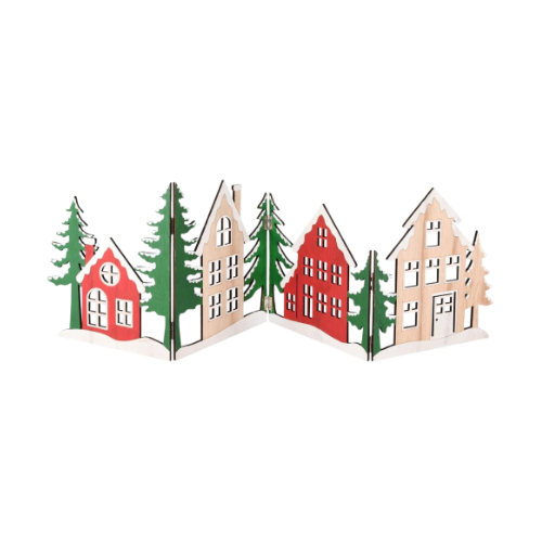 Mini aldea de madera con detalles encantadores, ideal para decorar mesas.